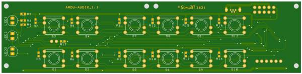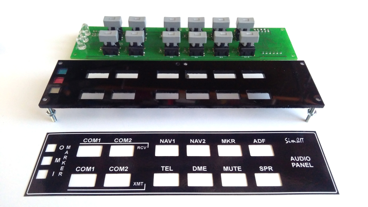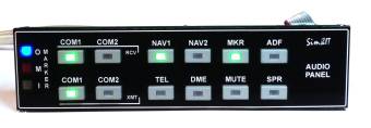 Das Audio-Panel ist von der Anordnung der Tasten in grober Anlehnung an das KMA-30 gestaltet. Das Panel wird über Ethernet mit dem FS-PC verbunden. Der Arduino-Sketch verarbeitet die Taster-Ereignisse, die über UDP (Ethernet) zu einer Schnittstellensoftware auf dem PC übertragen werden, der hieraus FS-Kommandos generiert. Die aktualisierten Variablen werden an das Audio-Panel übertragen und mit LED-Anzeigen dargestellt. Als Kommunikationssoftware kommen SimConnect-Clients für MSFS (FSX, FS2020) und P3D sowie X-Plane-Plugins für X-Plane zum Einsatz.