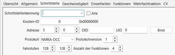 Den Loks wird in dieser Konfiguration kein Controller zugewiesen, da ja oben ein Controller für die Fahrregler (LC IID) eingetragen ist. Als Protokoll wird NMRA-DCC oder -long eingestellt.