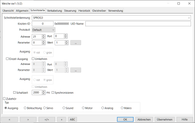 Deshalb wird bei den Eigenschaften der Weiche → Schnittstelle die DCC-Zentrale und die DCC-Adresse des Weichendekoders zugewiesen. Beim Reiter Weiche → Verkabelung wird unter CTC/ZBL der LocoBuffer als Bedienschnittstelle eingegeben, und die Adresse, die das LocoIO-Keypad bei Tastendruck sendet, um die Weiche zu schalten.