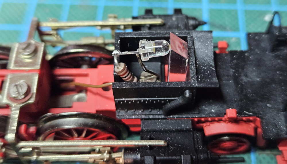 Jetzt habe ich anstelle des Lichtleiters zwei warmweiße SMD-LEDs, Bauform 0603 in die Lichtschächte eingeklebt. Beide LEDs sind in Reihe mit einem Vorwiderstand 10 kOhm an die Dekoderleitung angeschlossen. Der Widerstand wurde an einem Ende zu einer Öse gebogen und dort festgeschraubt, wo ursprünglich die Lampenfassung festgeschraubt wurde. Die Leitungen zu den LEDs wurden dort verlegt, wo vorher der Lichtleiter war. In die Lampen wurde UV-aushärtbarer transparenter Klebstoff eingebracht, so dass das Licht jetzt weiter vorn austritt.