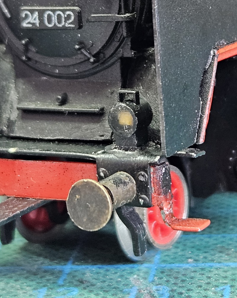 Die PIKO-Kupplung am Tender wurde so gelassen. Diese kuppelt gut mit den sonst verwendeten etwas neueren Märklin-Kurz-Kupplungen an den Wagen. Vorn ist noch den Haken.