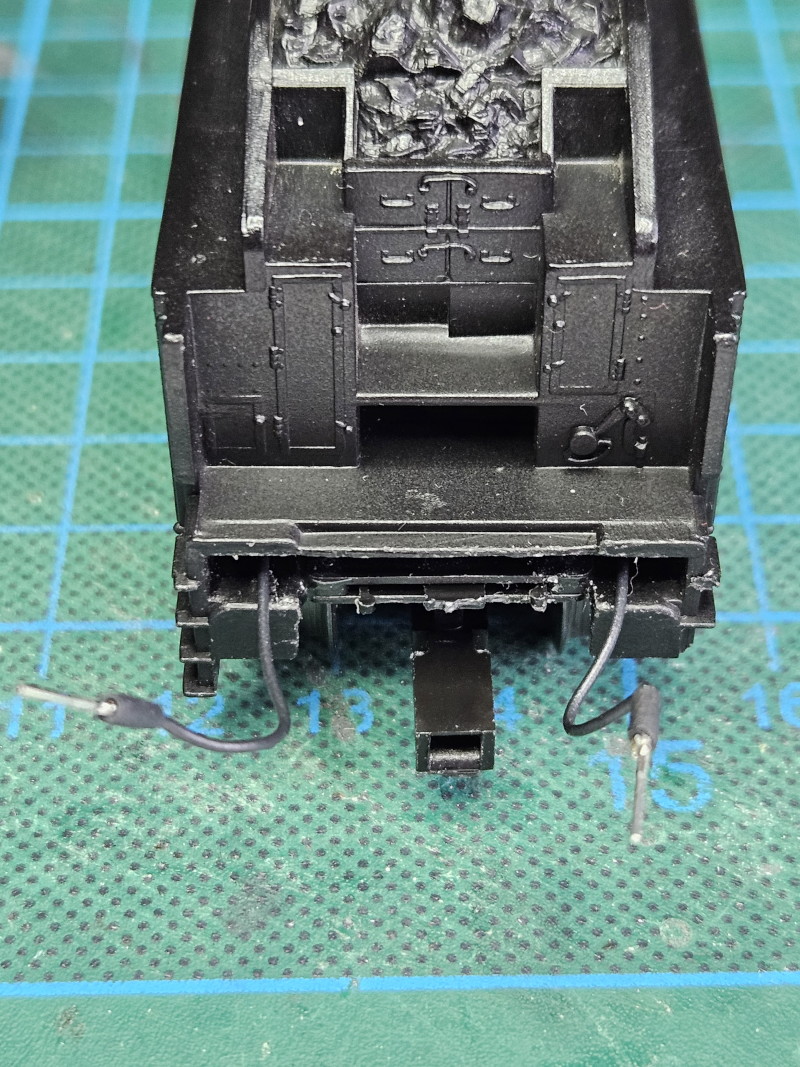 Neben den Motor wurden zwei Kontakthülsen geklebt, die die elektrische Verbindung zum Tender realisieren sollen. In diese werden mit Leitungen versehene Stifte gesteckt. Im Tender wurden die bisherigen Lampen aufgebohrt, so dass dort auch 0805-LEDs reinpassen.