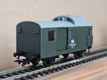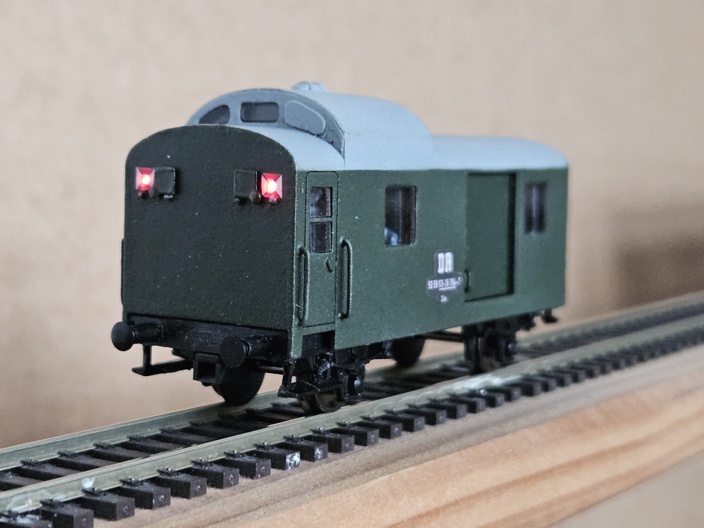Jetzt mit Farbe und Licht. Der Packwagen hat auch einen DCC-Dekoder mit einem ATtiny85 für die Konfiguration der Beleuchtung bekommen.