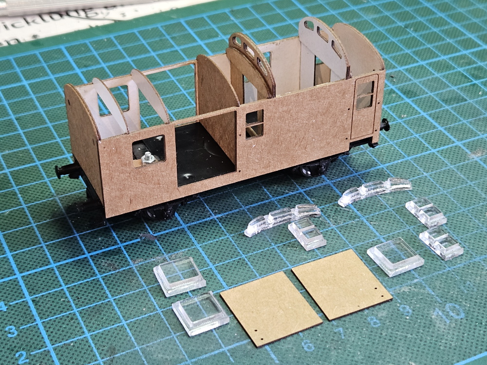 Ich habe die Seitenteile, Innenwände, Spanten und Türen für Laser-Cut gezeichnet und dann aus ca. 0,5 … 0,6 mm dickem Karton ausgelasert. Die Fenster wurden aus 3-mm-Acrylglas hergestelt. der Außenrand wurde mit geringerer Leistung angetragen. Die meisten Wände sind doppelt, die Innenteile sind um eine Katonstärke kleiner, so dass die Teile an-/ineineander passen.