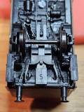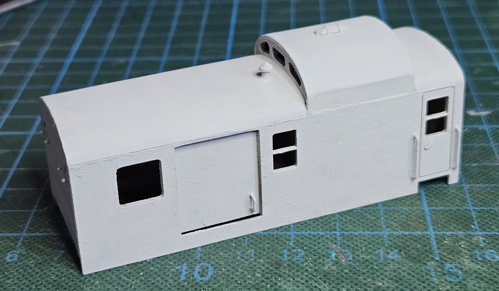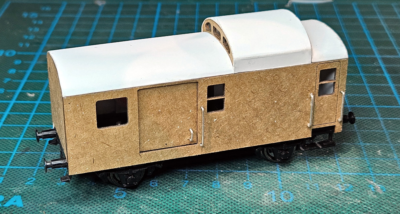 Die Haltegriffe sind aus Metalldraht geformt und mit Sekundenkleber eingeklebt worden. Die hier noch zu sehenden Haltegriffe am Tor habe ich wieder entfernt, da diese entsprechend obiger Quelle bei der Verwendung im Personenverkehr abmontiert wurden, zusammen mit den Trittbrettern dort. Auch das eine Oberlicht musste geschlossen werden. Dann wurde das Modell grundiert.