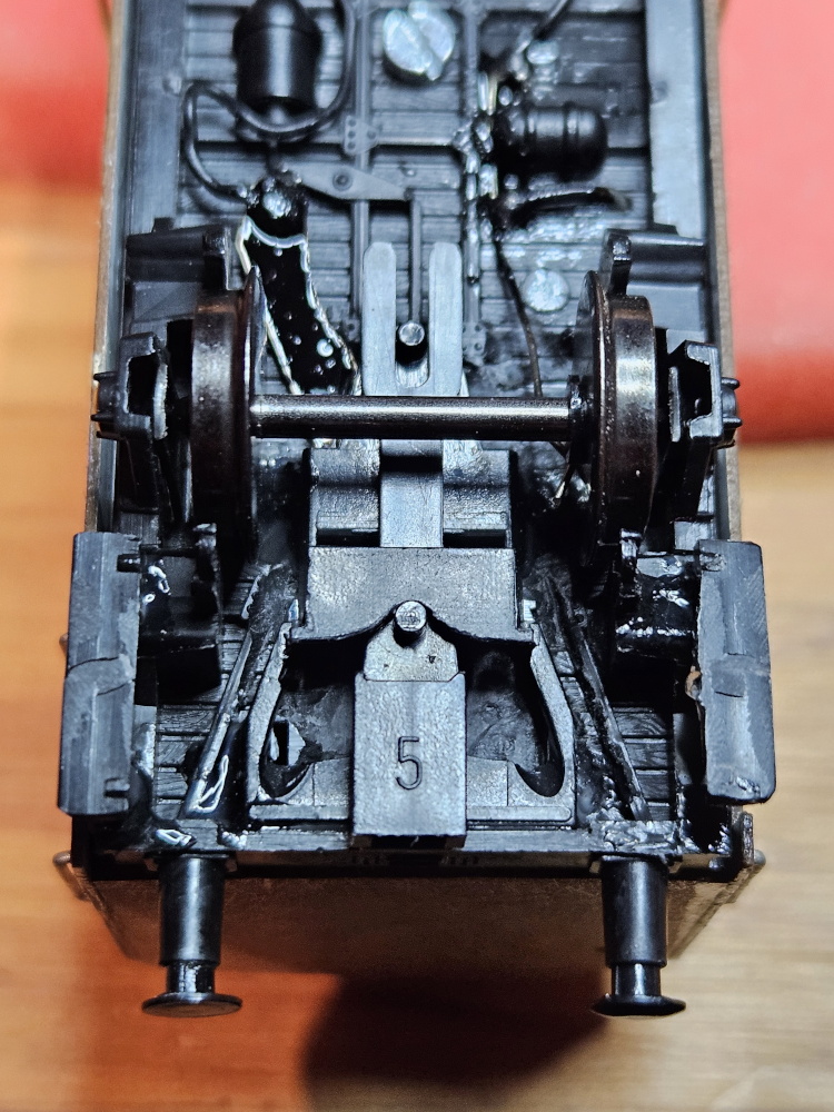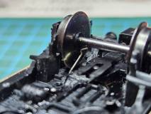 Das Fahrgestell wird von einem alten PIKO-Güterwagen verwendet, die Radsätze wurden getauscht. Wie schon bei anderen Güterwagen wird eine Roco-KKK eingebaut. Da der Wagen eine Beleuchtung erhalten soll, habe ich neben dem Abgriff der Spannung über die Achs-Lager auch eine zusätzliche Feder angebracht, die die Spannung auch am isolierten Rad abgreift.