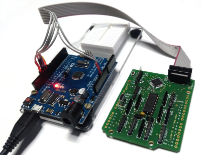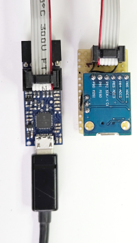 Arduino 5 V → 5 V (J1-Pin9)Arduino D10 → RESET (J1-Pin5)Arduino D11 → MOSI (J1-Pin6)Arduino D12 → MISO (J1-Pin8)Arduino D13 → SCK (J1-Pin2)Arduino GND → GND (J1-Pin7)Anschließend kann der Controller mit einem USB-Seriell-Adapter am Steckverbinder FTDI mit der IDE wie ein Arduino Pro Mini programmiert werden.