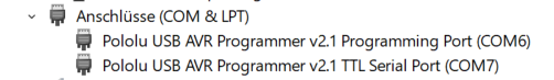 Von Pololu gibt es einen AVR-USB-Programmer, der kompatibel ist zum STK500. Im System meldet sich der Programmer mit zwei COM-Ports an. Ein Port dient als Programmer-Port und der andere als TTL-kompatibler serieller Port. Der Programmer kann für 5V- und 3,3V-Systeme programmiert werden: