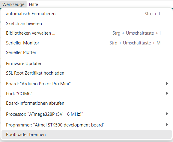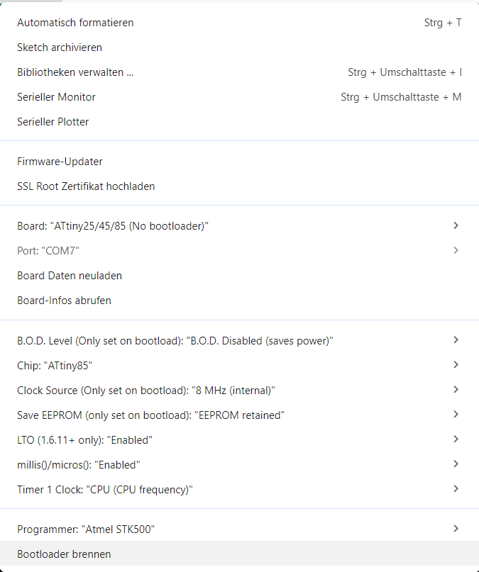 In der Arduino-IDE muss unter Werkzeuge das Zielsystem, der Programmer-Port und der Programmer eingetragen werden.