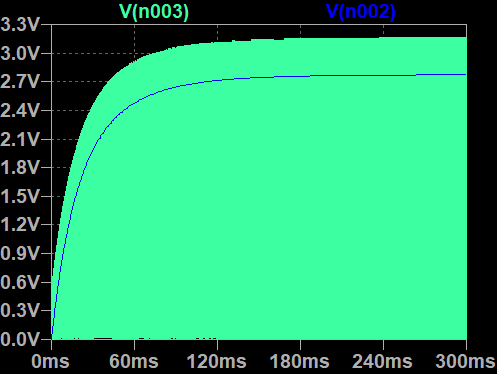 Die gleichgerichtete und geglättete Aussgangsspannung liegt um die Fluss-Spannung der Diode niedriger als der Spitzenwert. Zu beachten ist auch, dass der Eingangswiderstand des AD-Wandlers mindestens um den Faktor 10 größer sein sollte als der Ausgangswiderstand. Sinnvoll wäre ein Nachschalten eines Impedanzwandlers für einen niederohmigen Ausgang. Die Simulation zeigt auch, dass frühestens nach ca. 300ms erst das Ausgangssignal stabil ist. Dies ist z.B. bei nur kurzzeitiger Aktivierung der Messung zubeachten.
