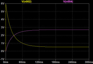 Oben wurde beschrieben, dass der Ausgang des Sensors sehr hochohmig ist, und ein nicht sehr hochohmiger Eingang des AD-Wandlers Einfluss auf dass Messergebnis haben kann. Eine Möglichkeit der Verbesserung mit einem OPV zur Verschiebung und Verstärkung des Signals wurde simuliert, ebenfalls mit 10pF und 200pF. Die Verstärkung wurde auf 2 festgelegt und die Mittenspannung wurde auf ca. 2V eingestellt. Das Signal ist jetzt invertiert. Bei niedrieger Bodenfeuchtigkeit wird ein niedriger Spannungswert ausgegeben, bei hoher Bodenfeuchtigkeit ein hoher Spannungswert (gelbes Signal. Bei der Simulation wird zum Anfang ein hoher Wert ausgegeben, der aber aufgrund der Betriebsspannung nicht so hoch ausfallen kann.