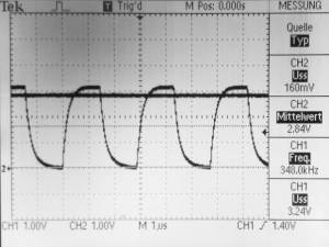 Durch den 10k-Widerstand und die veränderliche Kapazität, die durch die große Fläche der Spitze gebildet wird, wird das Ausgangssignal um die halbe Betriebsspannung herum verschliffen. Diese Spannung wird Spitzengleichgerichtet durch die nachfolgende Diode, den 1MOhm-Widerstand und den 1µF-Kondensator.