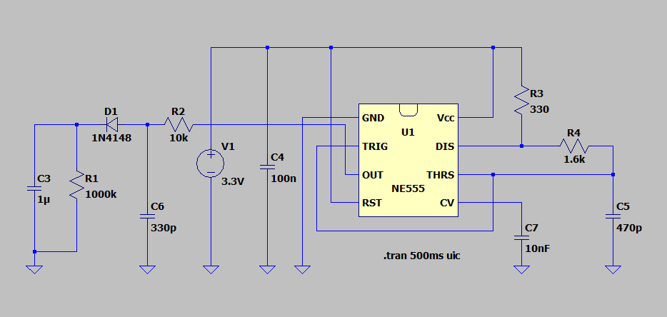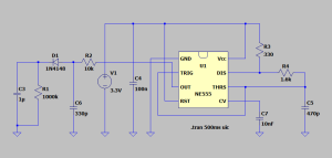 Im Internet gibt es einen kapazitiven Bodenfeuchtesensor (Capacitive Moisture Sensor). Als zentraler Baustein ist ein TL555 eingesetzt. Ich habe diesen näher untersucht, um Grenzwerte zu verstehen. Der Sensor arbeitet mit konstanter Frequenz, bei meinem Modell waren es 350kHz.