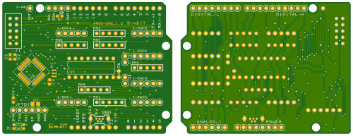 Die Leiterplatte kann in zwei Bestückungsvarianten aufgebaut werden. Die einfacher aufzubauende Variante „Shield“ ist als Zusatz für einen Arduino Uno R3 SMD gedacht. Voraussetzung ist, dass der Anschluss A6, der nur in der SMD-Variante des ATMega328 verfügbar ist, auch über die Leiterplatte zugänglich ist. Dies ist nicht bei allen Ausführungen der Fall. Alle anderen Anschlüsse werden für die Drehimpulsgeber und die Peripherie benötigt. Die je zwei Impulsausgänge der Drehimpulsgeber werden an Ports des Arduino geführt. Die Drucktaster werden an einen I²C-Portexpander PCF8574 gefüht. Der Interruptausgang initiiert über A6 des Arduino die Portabfrage beim Zustandswechsel.