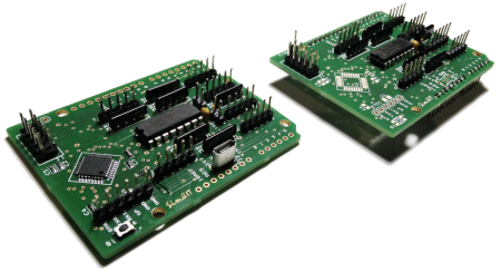 Die Leiterplatte ist im Arduino-Uno-Shield-Format gestaltet. Diese enthält bei voller Bestückung einen Arduino Pro Mini (ATMega328) und kann dann separat verwendet werden. Die abgerüstete Variante (Shield) wird auf einen Arduino Uno R3 SMD gesteckt. Angeschlossen werden dann das Ethernet-Modul und die 6 Drehimpulsgeber. Es können noch zwei einzelne Tasten angeschlossen werden.