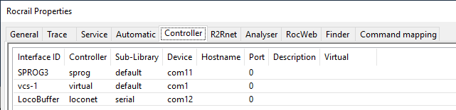 Diese Controller werden in Rocrail Eigenschaften → Zentrale eingetragen