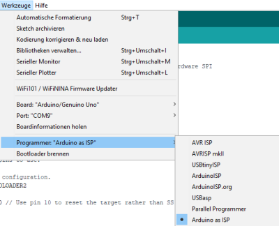 In der Arduino-IDE muss unter Werkzeuge das Zielsystem, der Programmer-Port und der Programmer eingetragen werden.