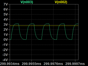 Anschließend habe ich die Schaltung mit LTSpice simuliert. Die Kapazität wurde mit 10pF für Luft und 200pF im Wasser simuliert.