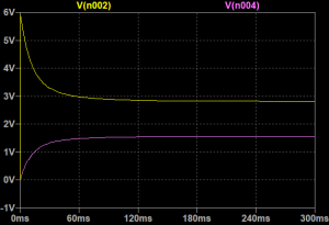 Oben wurde beschrieben, dass der Ausgang des Sensors sehr hochohmig ist, und ein nicht sehr hochohmiger Eingang des AD-Wandlers Einfluss auf dass Messergebnis haben kann. Eine Möglichkeit der Verbesserung mit einem OPV zur Verschiebung und Verstärkung des Signals wurde simuliert, ebenfalls mit 10pF und 200pF. Die Verstärkung wurde auf 2 festgelegt und die Mittenspannung wurde auf ca. 2V eingestellt. Das Signal ist jetzt invertiert. Bei niedrieger Bodenfeuchtigkeit wird ein niedriger Spannungswert ausgegeben, bei hoher Bodenfeuchtigkeit ein hoher Spannungswert (gelbes Signal. Bei der Simulation wird zum Anfang ein hoher Wert ausgegeben, der aber aufgrund der Betriebsspannung nicht so hoch ausfallen kann.