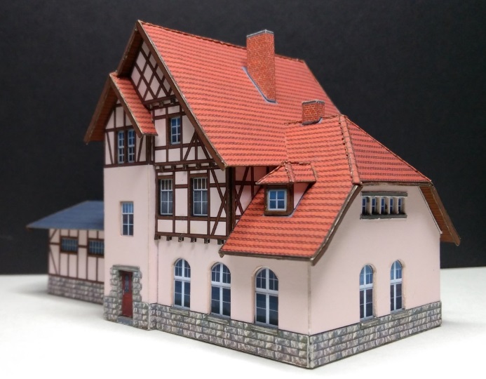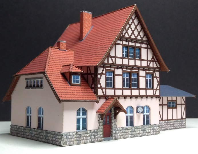 Kartonmodell eines Bahnhofsgebäude aus einem Buch von Günter Fromm „Modellbahn-Bauten“ in Maßstab 1:160. Der Bahnhof heißt im Buch „Kleindembach“. Sein jetziger Name „Langenorla Ost“